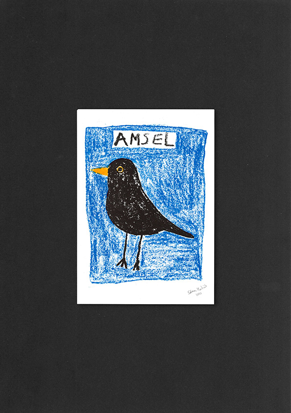Een risoprint van een merel getekend met krijt. Risoprint in blauw, zwart en sunflower yellow op Multidesign rough 100 gr. A4 €15,- © 2021