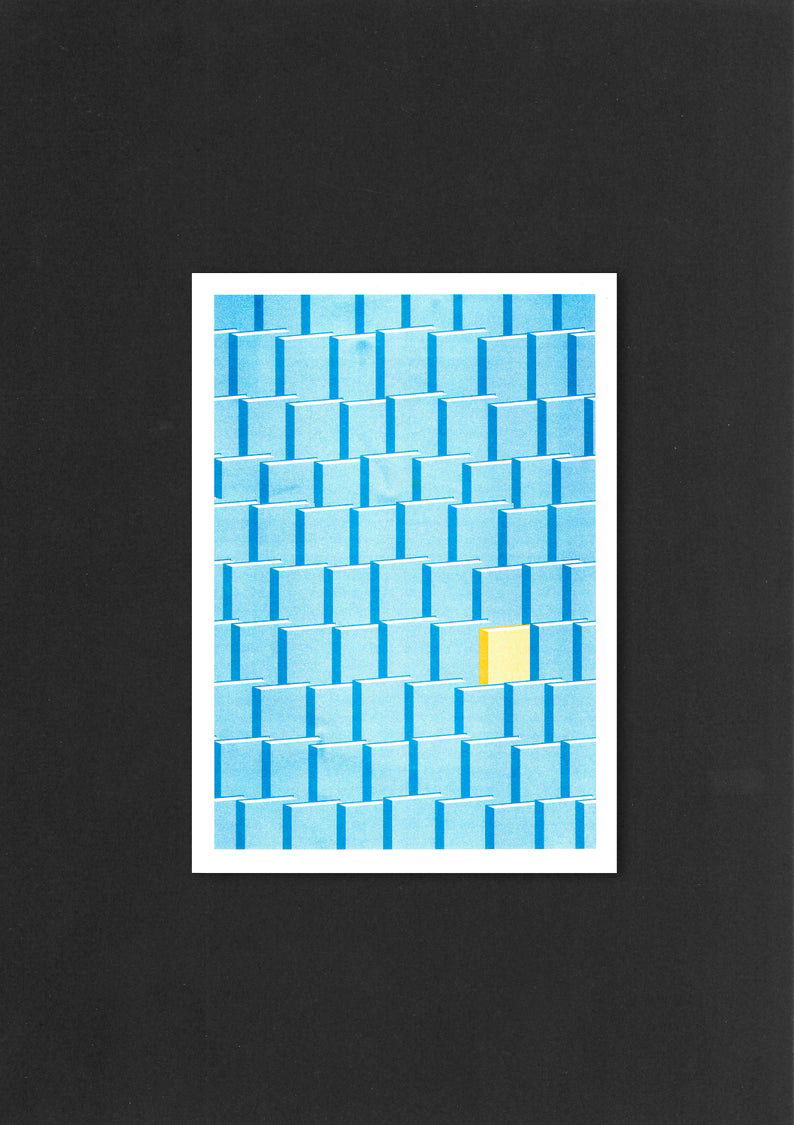 Een risoprint van een boek tussen boeken, in blauw en sunflower yellow A3 €15,- © 2021